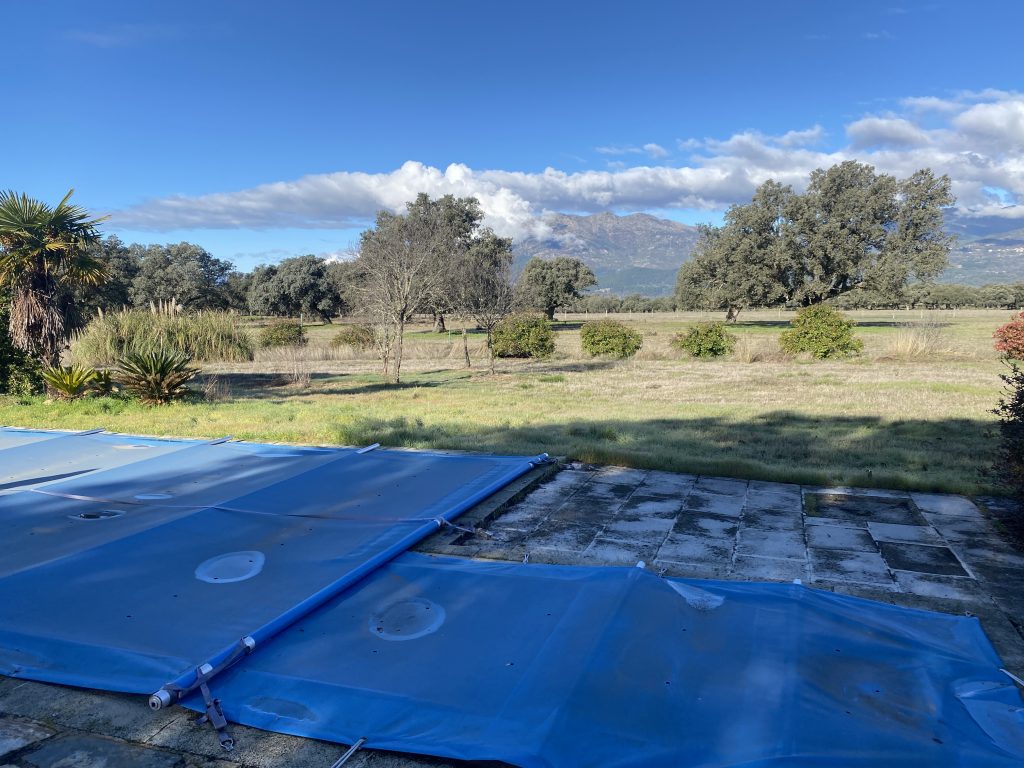 La finca está completamente vallada. Zona de piscina y pérgola de aparcamiento.