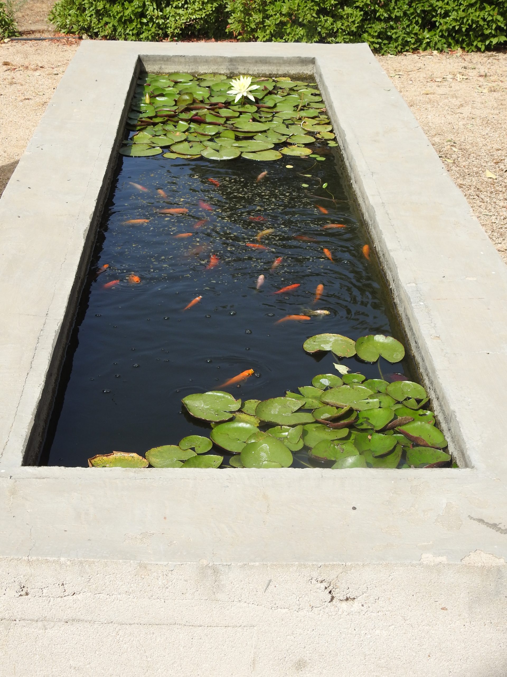 La piscina tiene formato de alberca alargada, con caños tipo fuente, con depuradora.