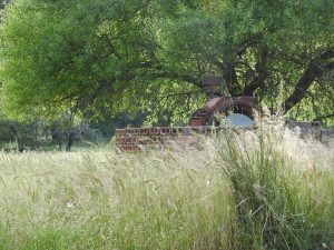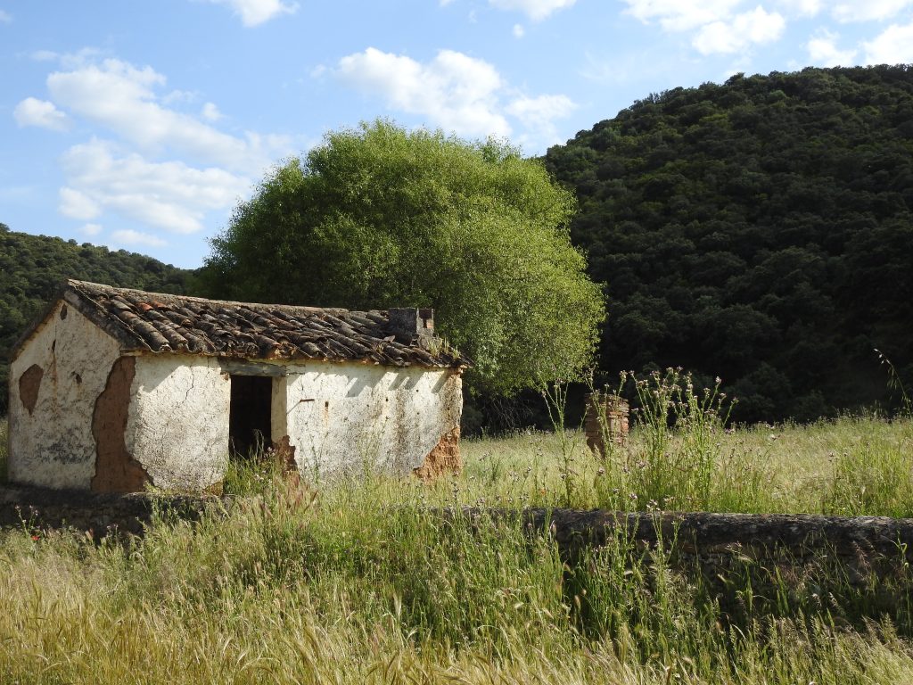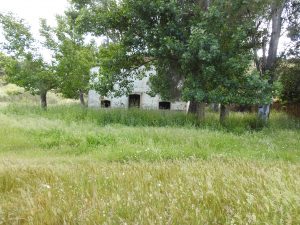 Hay una construcción caída correspondiente a una antigua vivienda y construcciones ganaderas.
